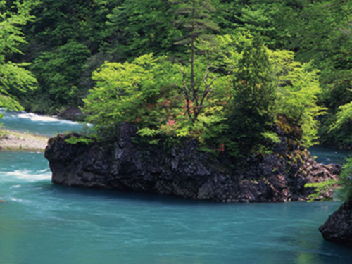 原生林、青い渓流と断崖絶壁が勇壮な渓谷美をみせます。